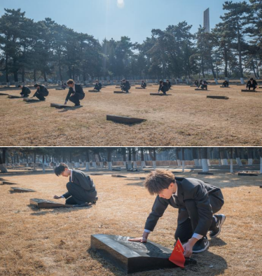 随后,学生代表列队前往烈士墓区开展祭扫活动。全体人员缓步绕行于烈士墓间,仔细拂拭墓碑上的浮尘,以此表达对革命烈士最深切的缅怀与敬意。